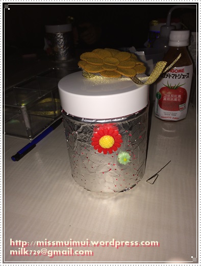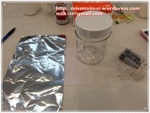 然後將錫紙圍在玻璃瓶上,放入LED 燈,關上瓶蓋,裝飾玻璃瓶,完成﹗