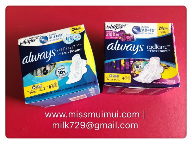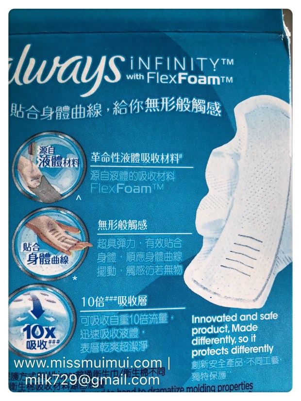 小妹自從轉用了Whisper Infinity 24cm液體衛生巾己經回了不頭﹗因為它的清爽感覺比棉衛生巾好,不過還是要記住每三小時換衛生巾一次,以保持衛生﹗